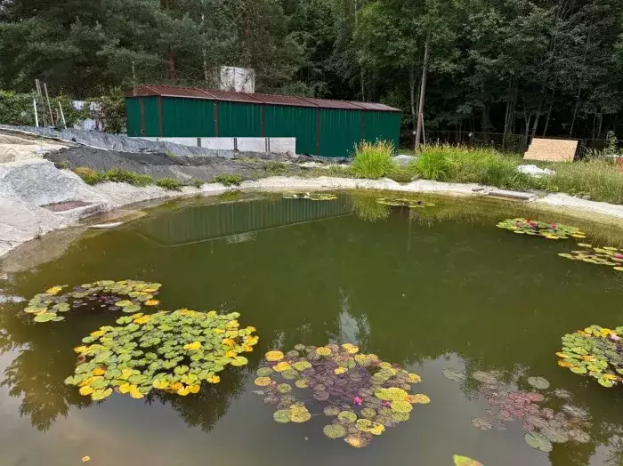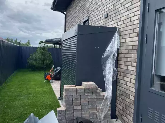 Контейнер необходимо было расположить на тротуарной плитке под навесом. Так как участок подтапливает во время дождей из-за особенностей грунта, нужно было сделать небольшое возвышение, при этом уместить конструкцию по высоте под навес. Под основание положили кирпичики под цвет сборно-разборного хозблока.