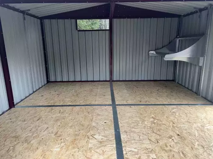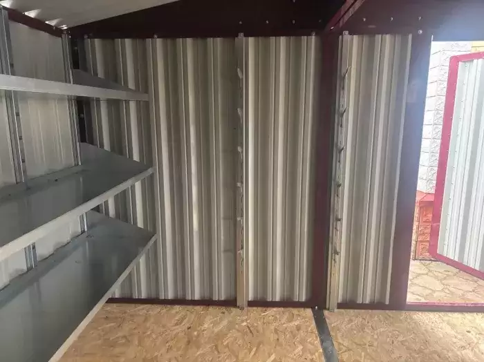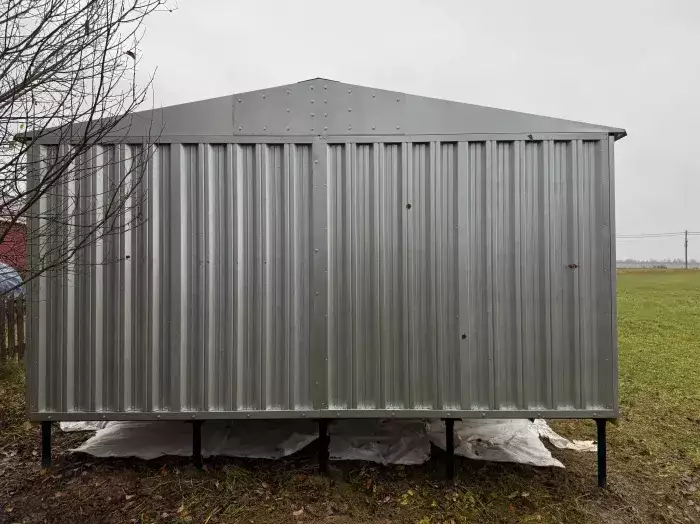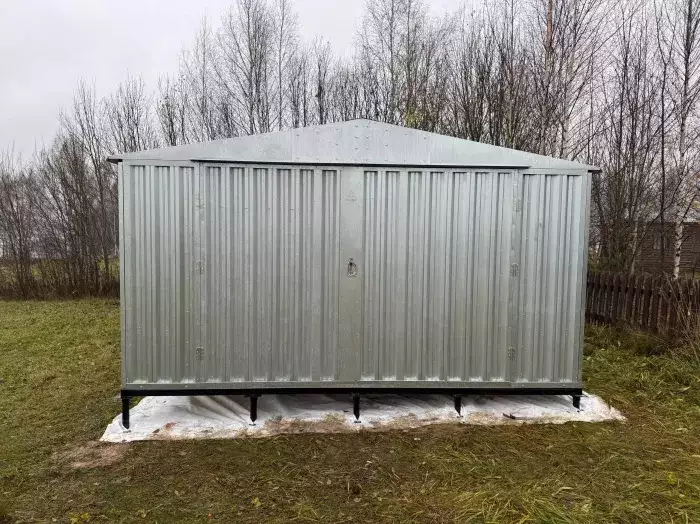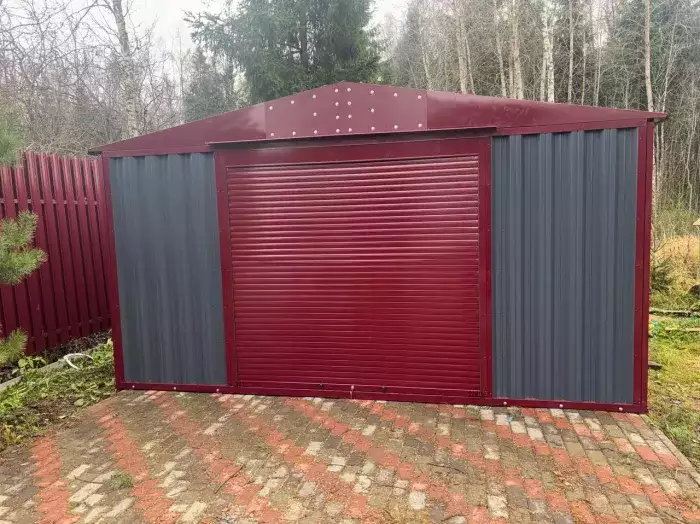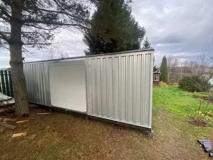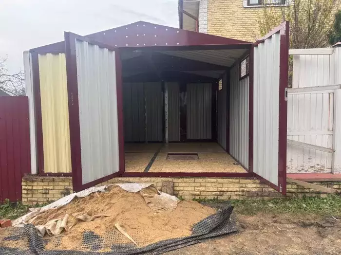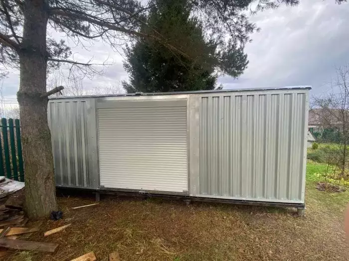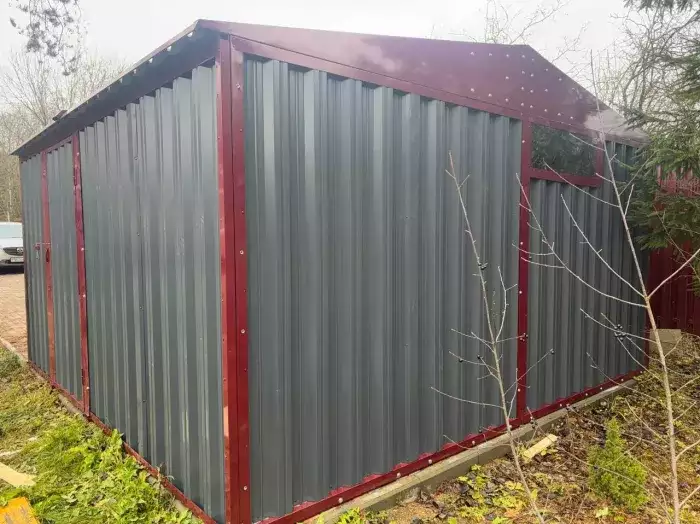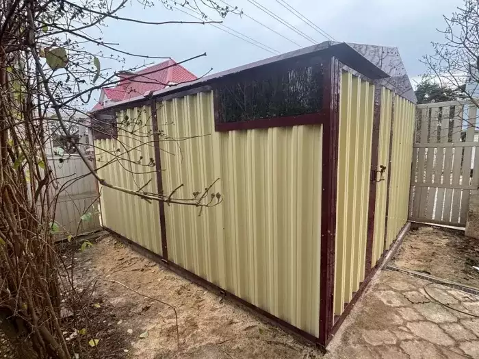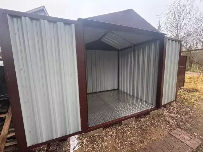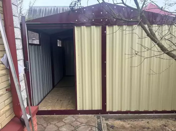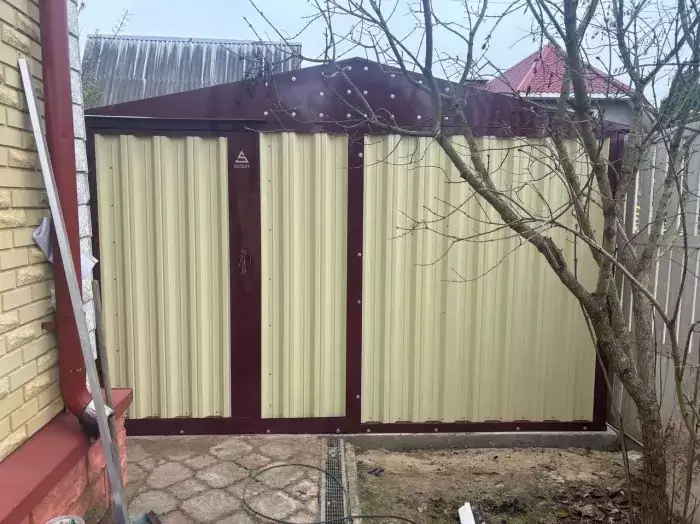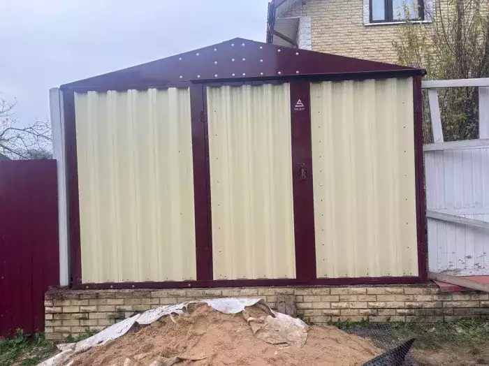Нами была изготовлена конструкция размером 5,06 х 2,7 х 2,45 м с двускатной крышей и торцевой воротной группой в красивейшем сочетании расцветок RAL 1014 «слоновая кость» для основных элементов и шоколадно-коричневого RAL 8017 для фасонных элементов и крыши.
