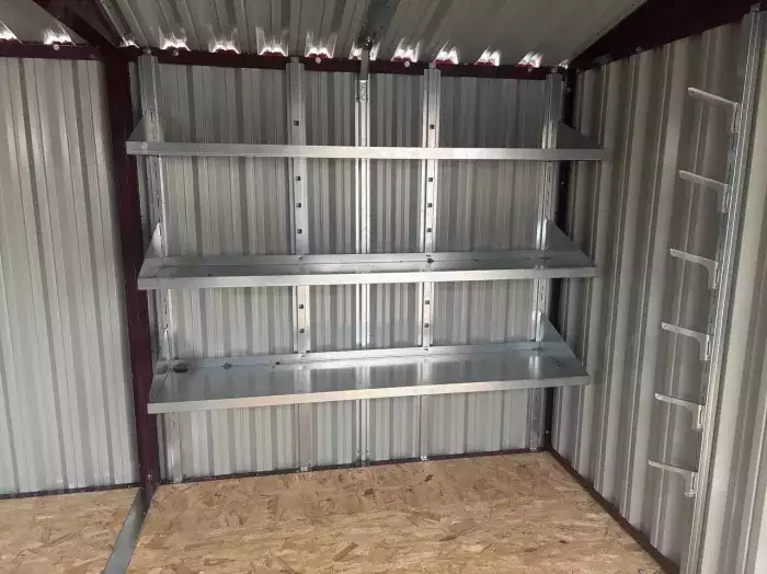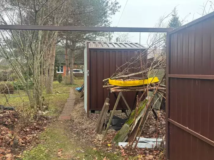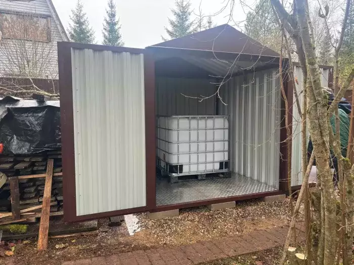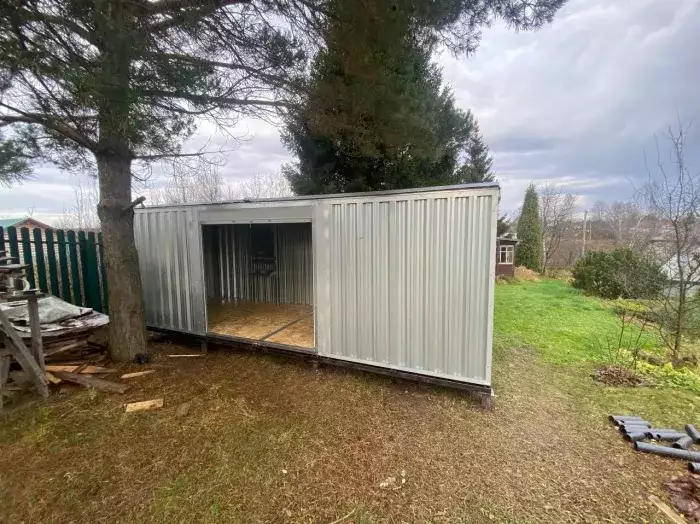 Заказчику этого проекта на участок был необходим вместительный хозблок для хранения садового инвентаря, автомобильных шин и прочих хозяйственных принадлежностей. Так как установка планировалась между забором и деревом, то нужны были индивидуальные параметры.