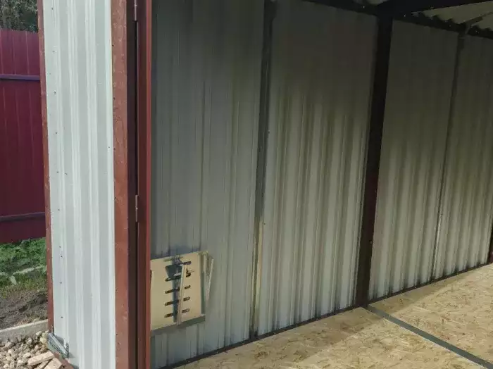 Для удобства эксплуатации хозблок дополнительно оборудовали прямым стеллажом с двумя полками, системой хранения инвентаря, пандусами для комфортного въезда техники, а также упорами для распашных ворот.