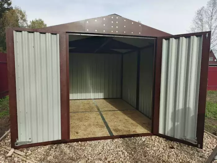 Нами была изготовлена стандартная 4-метровая конструкция с двускатной крышей и торцевой воротной группой в красивейшей расцветке «под дерево» Темный дуб.