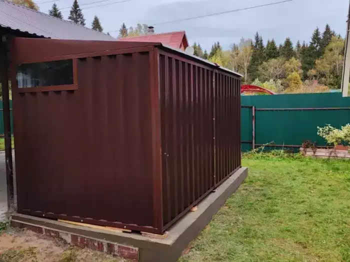 Так как в хозблок не планировался заезд габаритной техники, вместо полноценной воротной группы была установлена дверь шириной 1 м. По боковой стороне установили окно размером 90 х 30 см для попадания естественного света внутрь постройки. Также хозблок дополнили велосипедной стойкой.