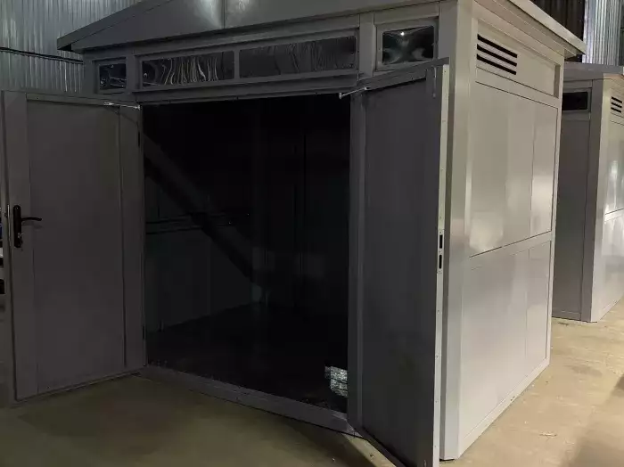 Дополнительно хозблок был оборудован световым окном для проникновения естественного света внутрь постройки, а также системой хранения инвентаря.