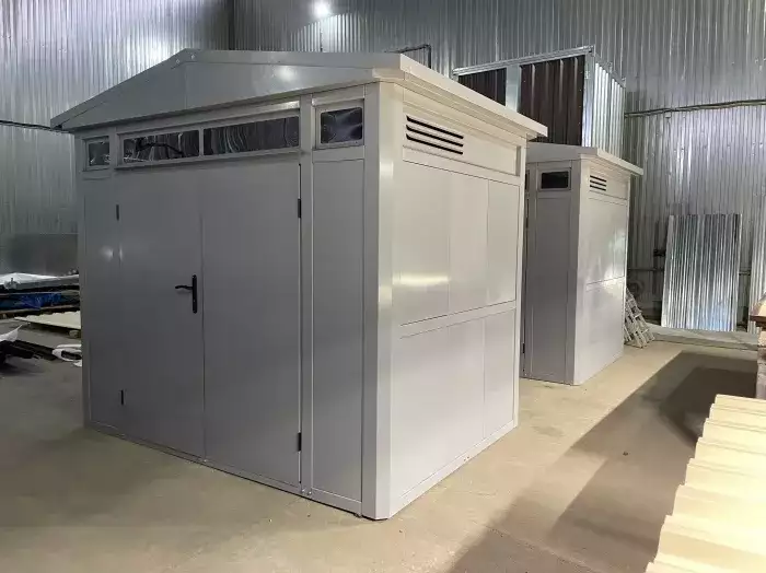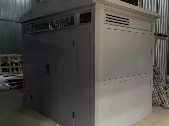 Подготовка площадки под постройку производилась нашими специалистами. Хозблок был установлен на бетонные блоки, а ящик временно установили внутри постройки, но в дальнейшем заказчик планирует переставить его в другое запланированное место.
