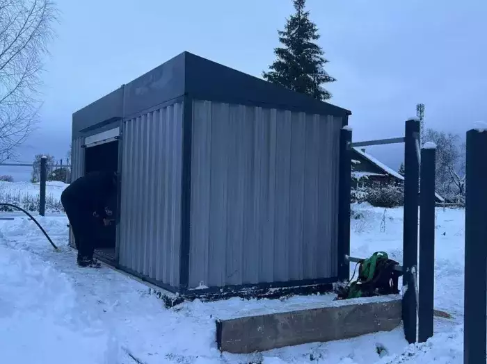 Нами была изготовлена стандартная 4-метровая конструкция с плоской крышей и торцевой воротной группой в сочетании цветов RAL 8019 для основных элементов и RAL 9003 для фасонных элементов. Дополнительно контейнер оборудовали световым окном размером 65 х 35 см.