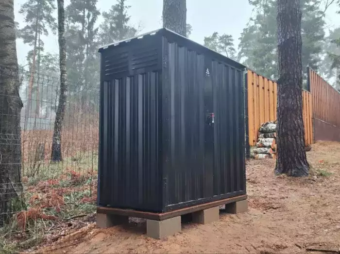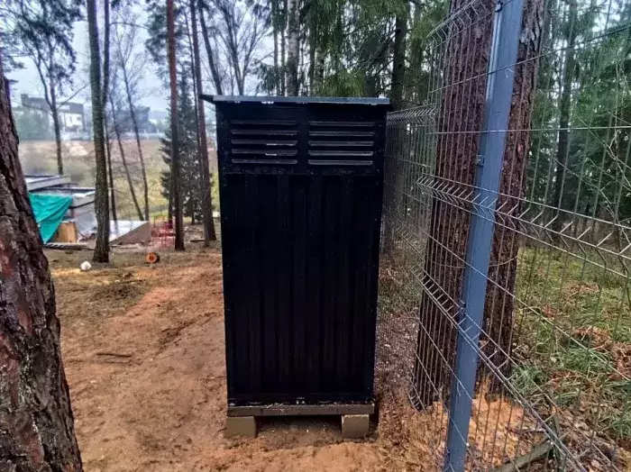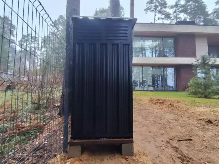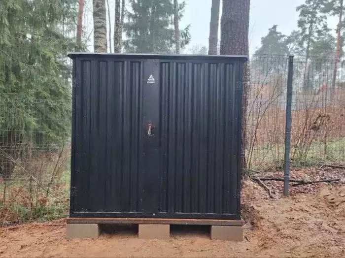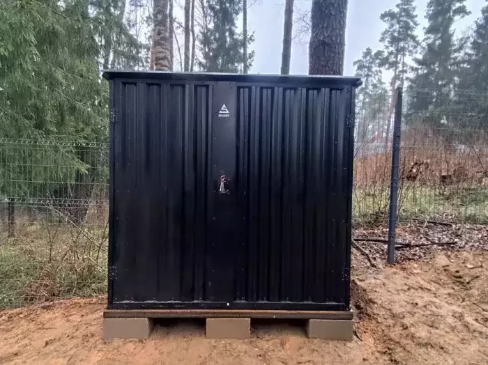 Гараж установили на блоки. Конструкция очень удачно вписалась в дизайн участка и радует своего хозяина своим элегантным видом. А Дарт Вейдер не только охраняет участок, но и готов сражаться с крапивой и прочими сорняками :)