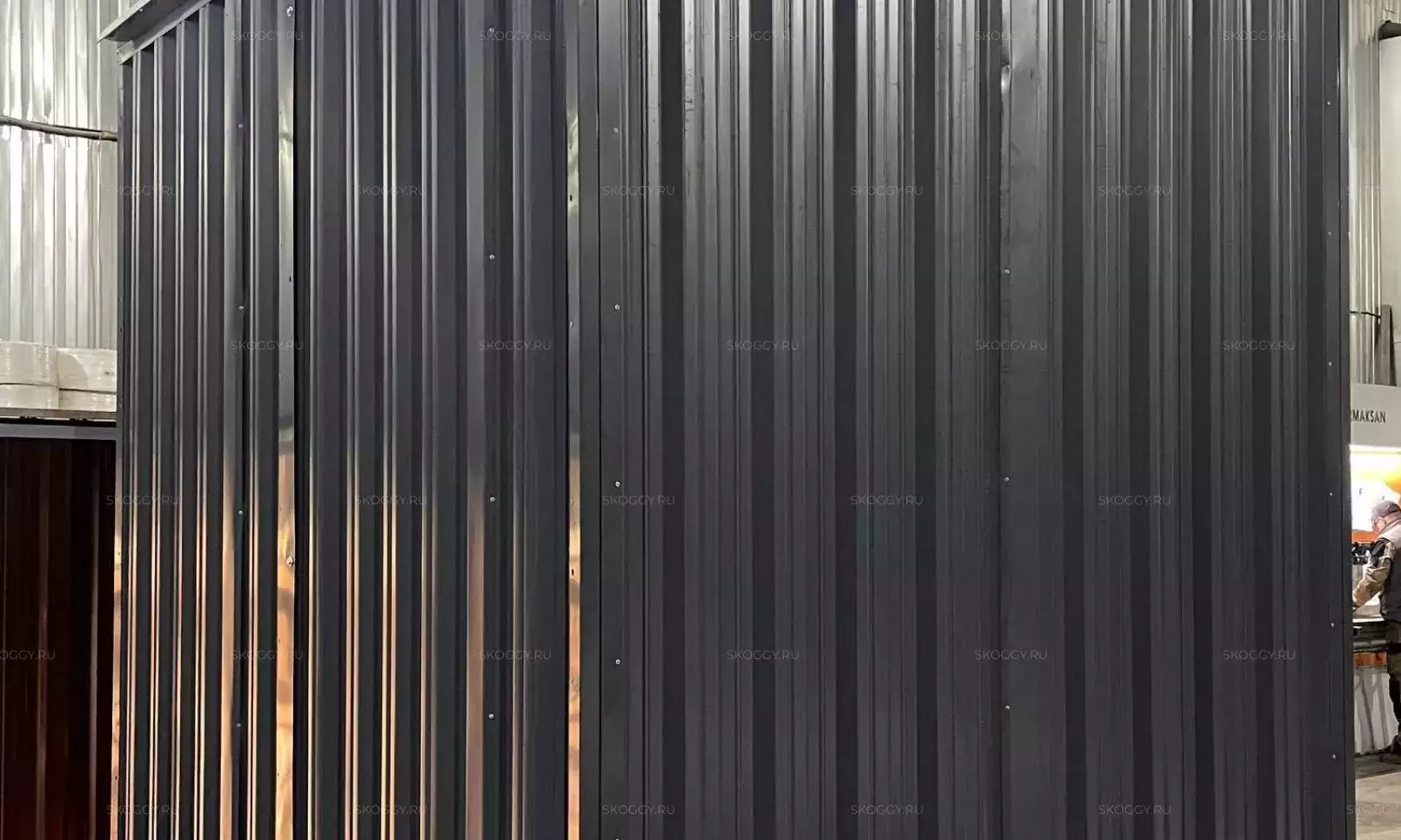 Нами была изготовлена люксовая конструкция размером 2,3 х 3,15 х 2,7 м с двускатной крышей в стильном и строгом графитовом цвете RAL 7024. Поверх OSB плиты был уложен металлический лист с чечевичным рифлением толщиной 1,5 мм.