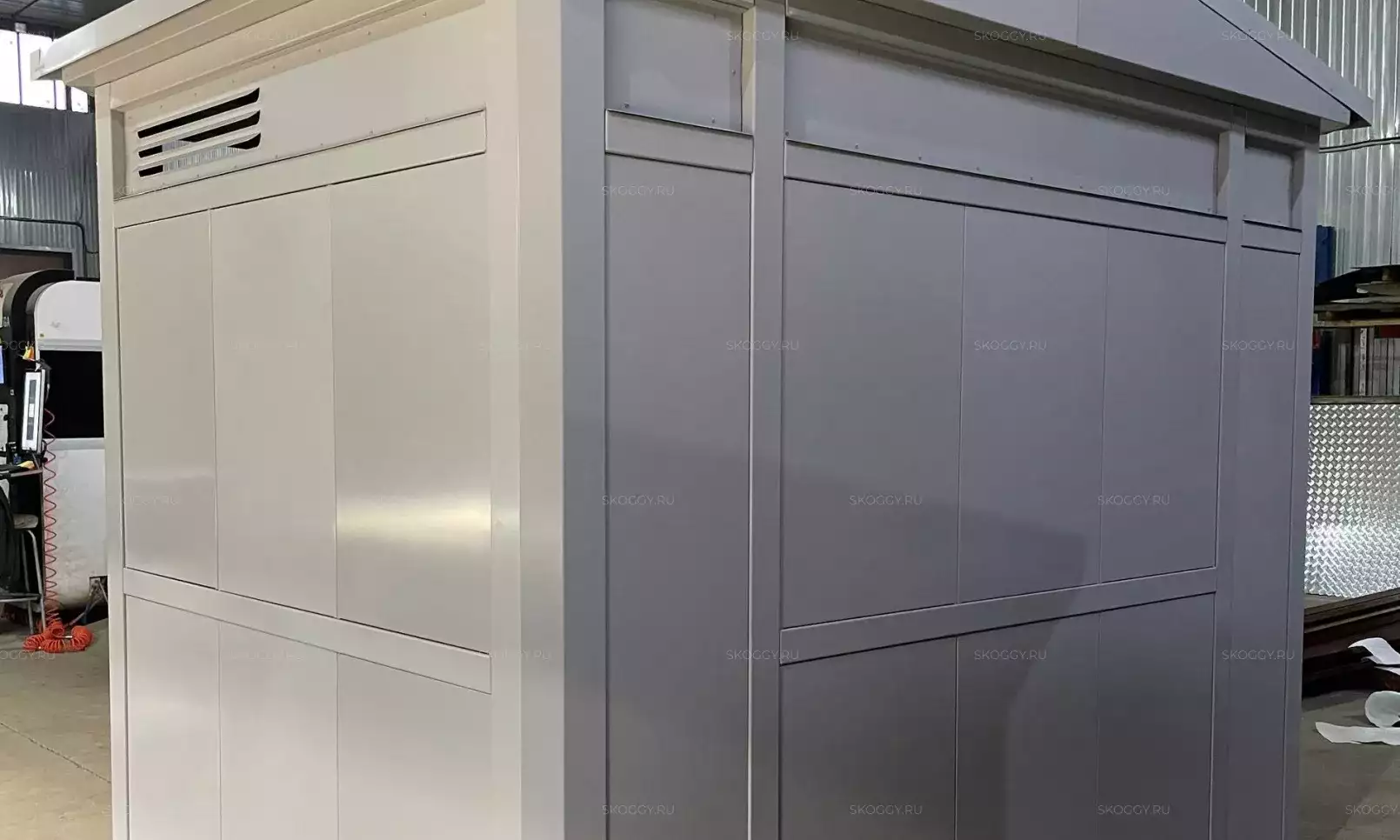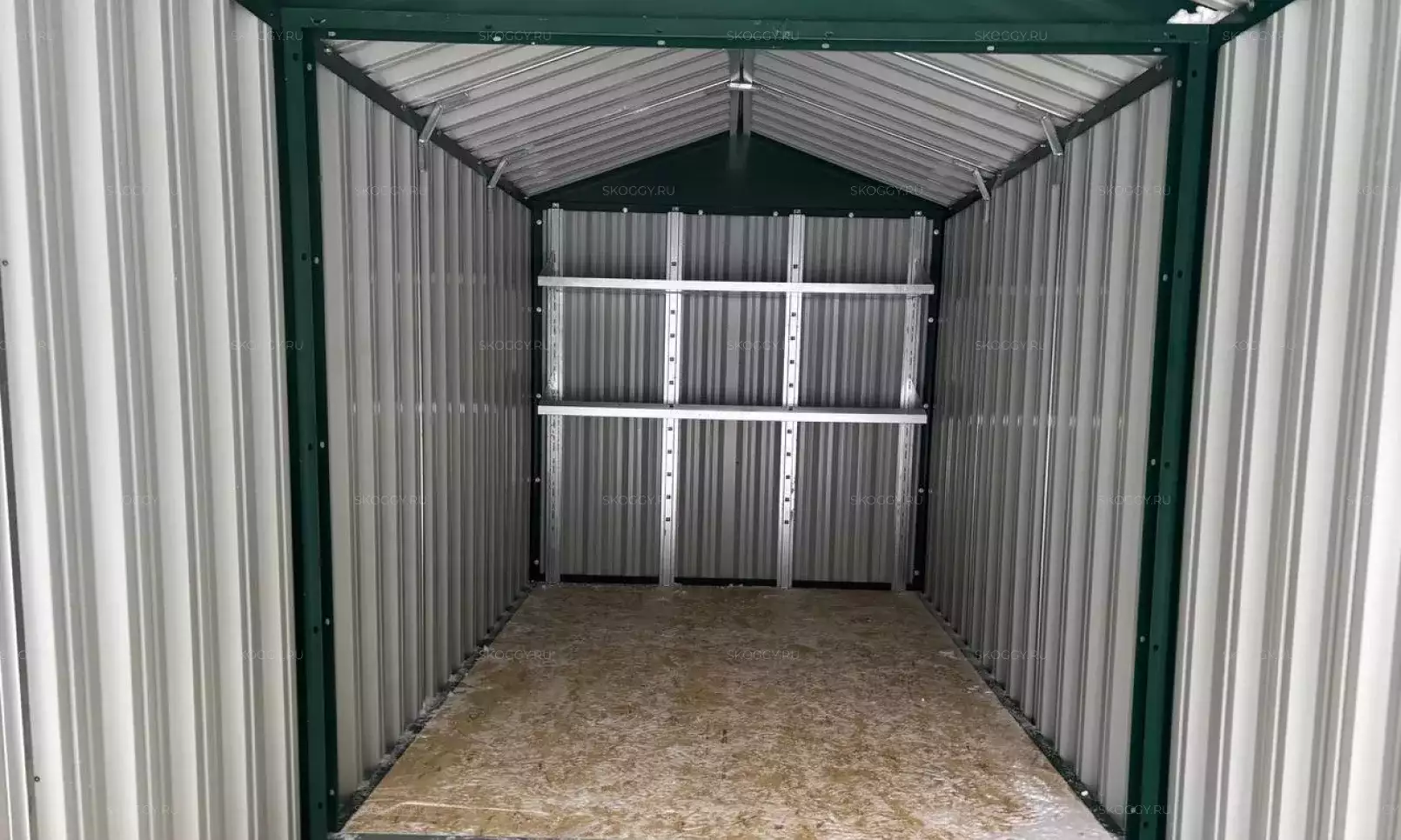 Дополнительно хозблок оборудован прямым стеллажом с тремя полками в стандартном цинковом цвете.