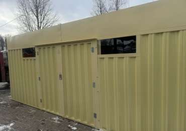 Дополнительно на боковую сторону конструкции была установлена еще одна воротная группа для удобства входа с обеих сторон, а также два окна для проникновения естественного света внутрь постройки.
